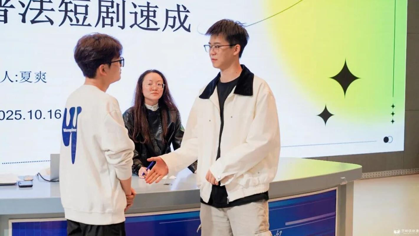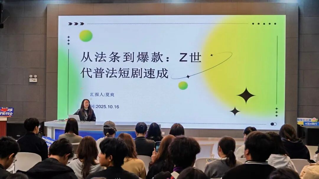 的同学们带来了一场专业而生动的创作分享。分享开始,夏爽现场邀请两位同学示范短剧创作中的人物关系,抛出悬念,然后从故事结构、人物塑造、情节设计等角度出发,结合普法主题,引导同学们思考如何将法律知识转化为具有感染力的戏剧情节。“法律是框架,但故事是灵魂”,她鼓励大家用专业的编剧手法,让普法内容更具传播力与共鸣感,为情景剧创作提供专业方向。