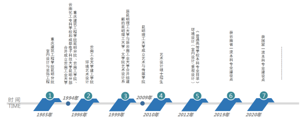 1985年以室内设计与装饰工程专业开设于重庆建筑工程学院昆明分院,1993年与云南工学院等组建云南工业大学,1998年云南工业大学等高校与加勒逼